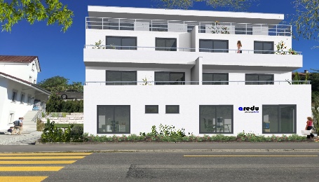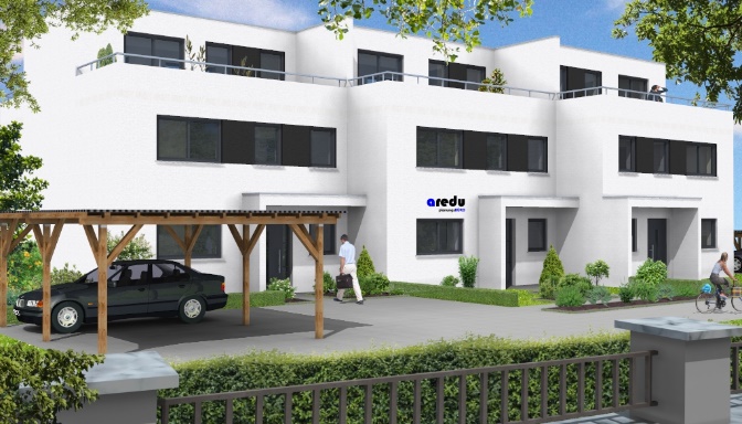 Als nächstes gibt es hier eine Planung von drei Reihenhäusern. Diese sind unterkellert, im Erdgeschoss befinden sich die Küche und der Wohn-Essbereich, im OG drei Schlafräume und ein Familienbad. Die Attika dient in erster Linie dem Zugang zur Dachterrasse und kann als Büro- oder auch Gästezimmer genutzt werden. Durch die versetzten Gebäude ergeben sich kleine geschützte Bereich, die nicht vom Nachbarn eingesehen werden können.