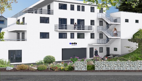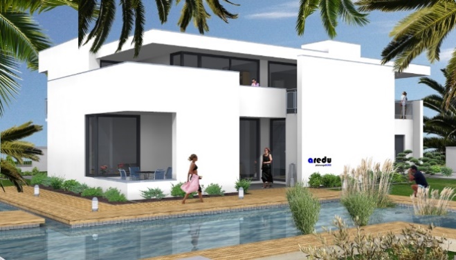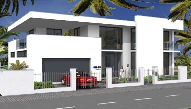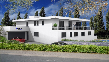 Auch die gehobene Architektur lässt sich so sehr anspruchsvoll gestalten. Dieses großzügig gestaltete Objekt erfordert ein großes Grundstück. Über einen geräumigen Eingangsbereich erreicht man auf der einen Seite des Gebäudes einen offen Koch-, Ess- und Wohnbereich. Auf der anderen Seite befinden sich die Doppelgarage und ein Hauswirtschaftsraum, der auch die Haustechnik beinhaltet und dazu noch Abstellfläche bietet. Über eine Treppe erreicht man das OG mit vier Schlafräumen und einem Familienbad. Die hier geplante Galerie bietet sich an, als Büro genutzt zu werden. Sie lässt sich auch sehr einfach in eine Ankleide umfunktionieren. Von jedem Raum im OG sind ein oder mehrere Balkone begehbar. Die unterschiedlichen Brüstungshöhen geben dem gesamten Gebäude seinen Charakter und bieten Sichtschutz von außen.